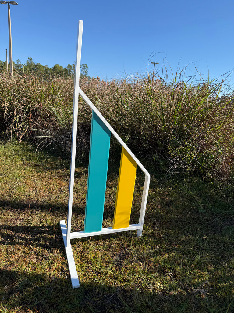Jump is one TURQUOISE panel and one YELLOW panel on each wing. Bar 5' long, white, with 3 TURQUOISE wraps on the bar. Picture below is an example.
